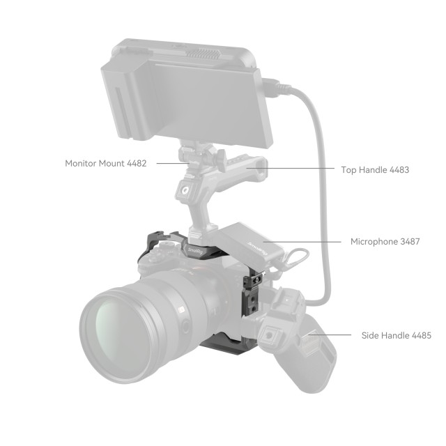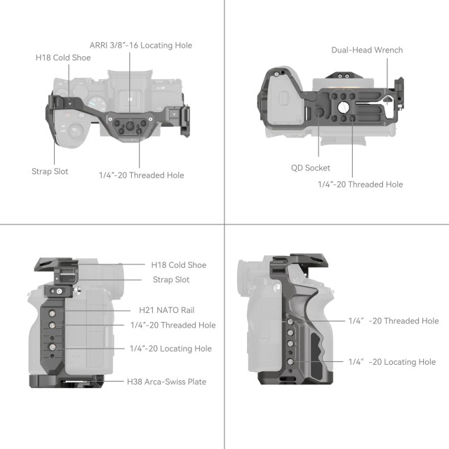Der SmallRig HawkLock Schnellverschlusskäfig für Sony Alpha 7R V / Alpha 7 IV / Alpha 7S III / Alpha 1 / Alpha 7R IV 4481 wurde entwickelt, um Zubehörhalterungen zu ermöglichen und die Kamera zu schützen. Die patentierte, selbst entwickelte Schnellverschluss-Struktur (HawkLock genannt) deckt Cold Shoes, NATO-Schiene und Arca Swiss ab, die mit HawkLock Öko-Zubehör verwendet wird, um eine solide und keine falsche Position zu realisieren, einen Druck zum Laden, Loslassen zum Verriegeln und die Effizienz der Demontage zu verbessern. Die Kamera wird über einen unteren Fixierstift, eine 1/4"-20 Schraube und eine M2,5 Schraube auf der linken Seite befestigt. Die seitlichen Verriegelungsadapter müssen in der Einbaurichtung an die verschiedenen Kameratypen angepasst werden. Der Aufdruck "A7 IV" ist für Alpha 7 IV und Alpha 7R V, während der Aufdruck "A7S III" für Alpha 7S III / Alpha 1 / Alpha 7R IV steht. Eingebaute, umlaufende Schutzabstandshalter verhindern, dass die Kamera zerkratzt wird. Der Käfig ermöglicht den Zugang zu Schnittstellen, Einstellrädern, Tasten oder Batterieklappen. Im Batteriefach befindet sich ein Spindelschlüssel, der sich der Kamerakrümmung anpasst und Platz für einen kleinen Finger lässt, um die Kamera bequem greifen zu können. 1/4"-20-Gewindebohrungen, ARRI 3/8"-16-Aufnahmelöcher und HawkLock-Kaltschuhhalterungen unterstützen den oberen Handgriff 2165C, den seitlichen Handgriff 2093, die Monitorhalterung 2903, Mikrofone, LED-Leuchten, Monitore usw. Die untere QD-Buchse unterstützt den QD-Schultergurt. HawkLock Arca-Swiss Schnellwechselplatte an der Unterseite ist kompatibel mit DJI RS 2 / RSC 2 / RS 3 / RS 3 Pro, der Schnellwechselplatte (Riser Plate) des DJI RS 2/RSC 2 Stabilisators für Stabilisatoraufnahmen und der Arca-Swiss Schnellwechselplatte 3154. Löcher an den Seiten und am Boden des Käfigs ermöglichen die Anbringung von Zubehör wie der Handschlaufe PAC2456. Außerdem verfügt der Käfig über einen eingebauten Magnetschlüssel, der die Demontage und Montage erleichtert.