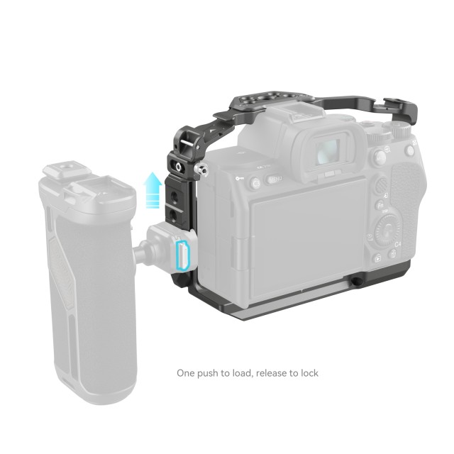 SmallRig HawkLock Quick Release Cage für Sony Alpha 7R V / Alpha 7 IV / Alpha 7S III / Alpha 1 / Alpha 7R IV 4481 wurde entwickelt, um Zubehörhalterungen zu bieten und die Kamera zu schützen. Die patentierte, selbst entwickelte Schnellverschluss-Struktur (HawkLock genannt) deckt Cold Shoes, NATO-Schiene und Arca Swiss ab, die mit HawkLock Öko-Zubehör verwendet wird, um eine solide und keine falsche Position zu realisieren, einen Druck zum Laden, Loslassen zum Verriegeln und die Effizienz der Demontage zu verbessern. Es verriegelt die Kamera über einen unteren Fixierstift, eine 1/4"-20 Schraube und eine M2,5 Schraube auf der linken Seite.