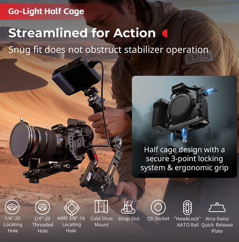 Das 3-Punkt-Verriegelungssystem sichert die Kamera mit einer 1/4"-20-Außengewindeschraube und zwei seitlichen Befestigungslöchern am Käfig und sorgt so für eine stabile und verdrehungsfreie Befestigung. Die QD-Buchse (Quick Detach) ermöglicht bei Bedarf ein schnelles und einfaches Entfernen des Käfigs. Zusätzlich gibt es eine Kaltschuhhalterung für die Befestigung von leichtem Zubehör und einen Riemenschlitz für einen Handgelenk- oder Schultergurt.