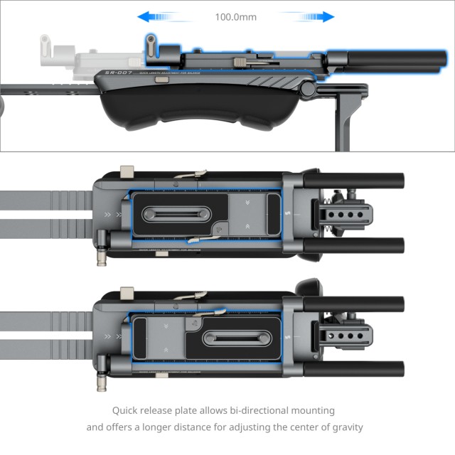 Das Schulter-Rig-Kit verfügt über ergonomische Griffe mit feiner Textur, die einen bequemen Griff bieten und eine 360°-Drehung ermöglichen. Die Verbindungswelle der Verlängerungsarme kann für eine optimale Kontrolle horizontal verstellt werden, während die stromlinienförmigen Schulter- und Rückenpolster einen hervorragenden Halt bieten. Das Rückenpolster lässt sich um bis zu 90° verstellen, so dass es in jedem Aufnahmewinkel gut sitzt, und die Schnellwechselplatte ermöglicht eine einfache Anpassung von vorne nach hinten für ein schnelles Gleichgewicht.