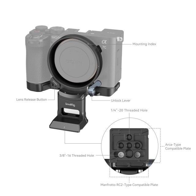 SmallRig Horizontal-to-Vertical Mount Plate Kit für Sony Alpha 7C II / Alpha 7CR 4570 wurde entwickelt, um schnell zwischen horizontalem und vertikalem Modus zu wechseln, ohne die optische Achse des Objektivs zu verstellen. Es wird an der Unterseite der Kamera mit einer 1/4"-20-Schraube und einem Anti-Dreh-Stift befestigt und bietet vollen Zugang zum LCD-Flip-Screen und den Anschlüssen sowie integrierte Pads, die Kratzer und Verdrehungen verhindern.