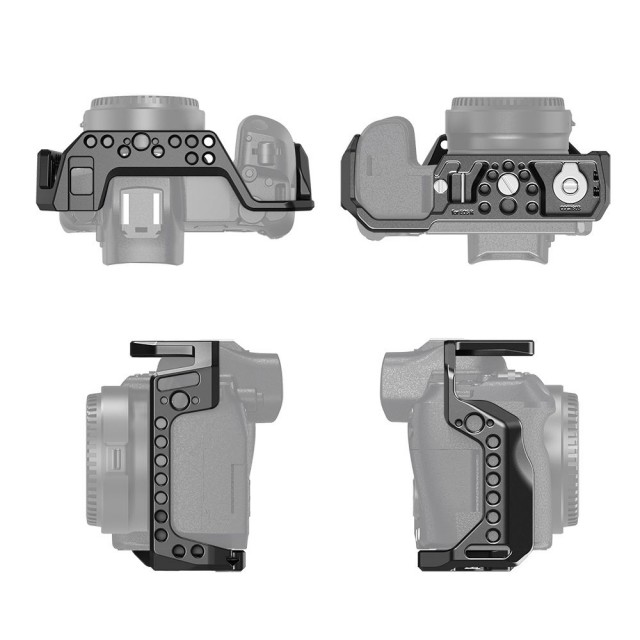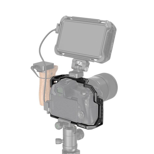 ist ein formschlüssiger Vollkäfig, der Schutz und Zubehörhalterungen für Ihre Kamera bietet. Der Käfig wird mit einer 1/4"-20 Schraube an der Unterseite der Kamera befestigt und verfügt über zwei Stifte zur Verdrehsicherung. Er verfügt über mehrere 1/4"-20- und 3/8"-16-Gewindebohrungen, ARRI-Zubehörgewinde und einen kalten Schuh, der die Montage von Zubehör ermöglicht. Sie können zum Beispiel den SmallRig Top Handle 2165 oder den SmallRig Wooden Side Handle 2093 für handgeführte Aufnahmen montieren, den SmallRig Ball Head Magic Arm 2070 oder den SmallRig Monitor Holder 1842 zur Befestigung eines Monitors. Es funktioniert mit der SmallRig Kabelklemme 1822, um das HDMI-Kabel und den Anschluss zu schützen. Wenn Sie den Canon EF-EOS R Objektivadapter verwenden, können Sie SmallRig BSA2696 verwenden, um den Adapter zu stützen und den Druck des schweren Objektivs zu verringern. Außerdem verfügt der Käfig über eine integrierte Arca Swiss QR-Platte und einen flachen Schraubendreher an der Unterseite.