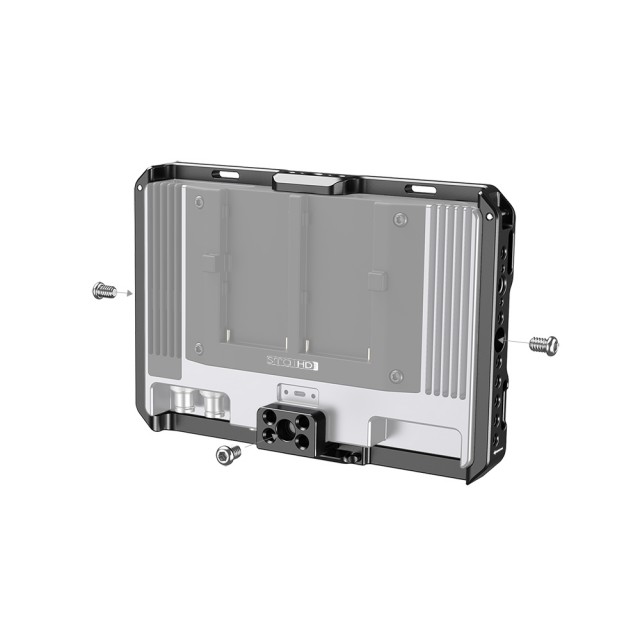 Der SmallRig Käfig mit Sonnenschutz für den SmallHD 702 Touch Monitor CMS2684 wurde entwickelt, um einen Rundumschutz und Zubehörhalterungen für den Monitor zu bieten. Der Käfig wird mit drei 1/4"-20 Schrauben am Monitor befestigt, je eine oben und unten und eine auf der Rückseite. Mehrere 1/4''-20 und ARRI 3/8''-16 Gewinde ermöglichen die Montage von Zubehör wie dem Magic Arm 2115, der Monitorhalterung BSE2348 und der Halterung für drahtlose Empfänger 2107. An der Unterseite befindet sich eine NATO-Schiene für NATO-kompatibles Zubehör, wie z. B. die Monitorhalterung BSE2385, mit der Sie Ihr Setup schnell lösen können. Die mitgelieferte Sonnenblende sorgt für Blendschutz bei Außenaufnahmen. Die Rückplatte ist mit der V-Lock-Batteriehalterung 1846 zur Befestigung einer V-Mount-Batterie kompatibel. Im Inneren befinden sich mehrere Gummipuffer, um den Monitor vor Kratzern zu schützen.