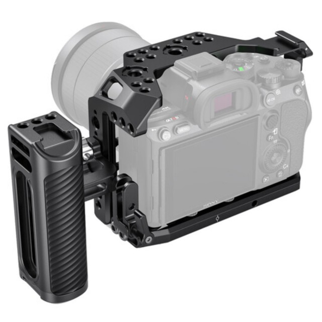 Fügen Sie Ihrer spiegellosen Sony a7R IV Kamera mit diesem Full Cage Kit mit Seitengriff von SmallRig Schutz und eine Vielzahl von Zubehör hinzu. Das Kit umfasst einen kompletten Kamerakäfig, einen Seitengriff mit 1/4"-20 Befestigungsschrauben und eine HDMI-Kabelklemme.