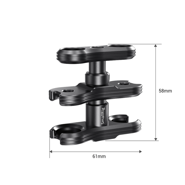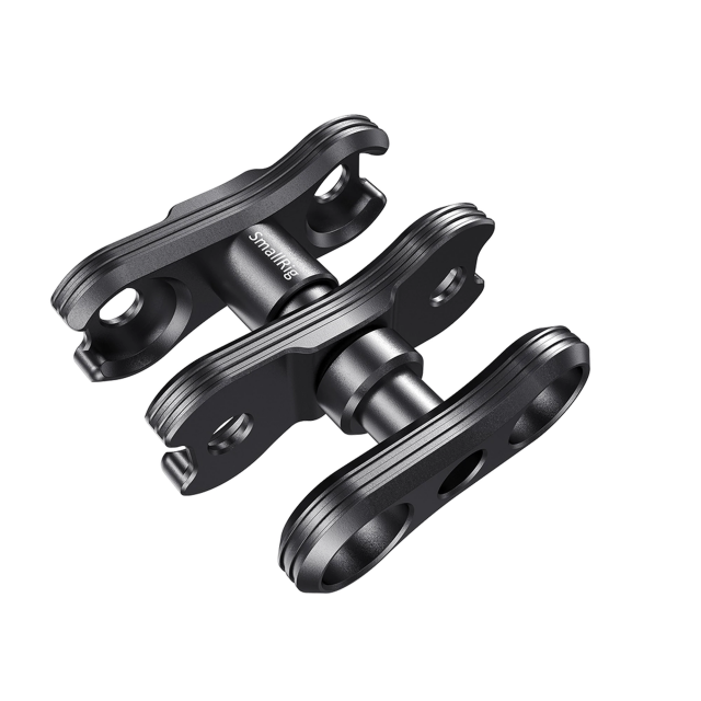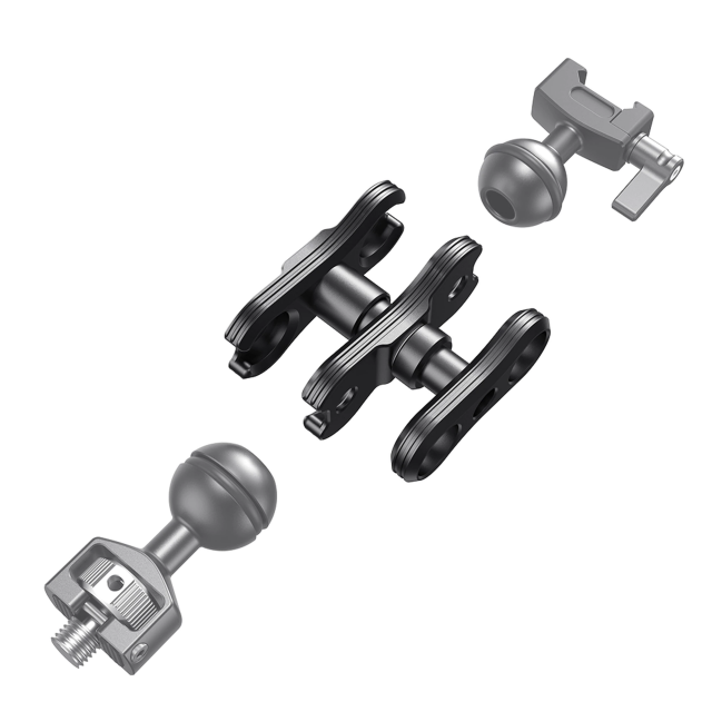 Diese Kugelkopfklemme ist ein Verbindungsstück für zwei SmallRig-Kugelkopfkomponenten (Kugelkopf mit 1/4-20-Schraube 2132, Kugelkopf mit NATO-Klemme 2133, Kugelkopf mit Arri-Aufnahmebolzen 2114 und Kugelkopf-Verlängerungsstange 2108). Eine einzelne Flügelmutter wird verwendet, um die beiden Kugelköpfe fest zu arretieren, und ermöglicht die bequeme Einstellung der Winkel des Arms.