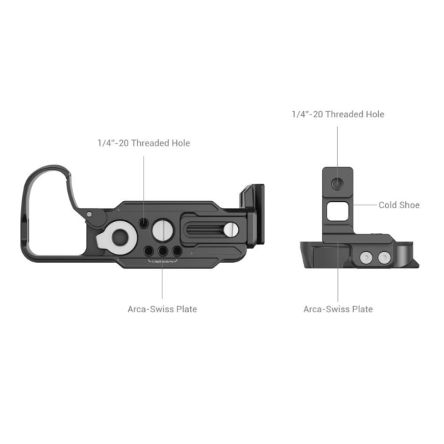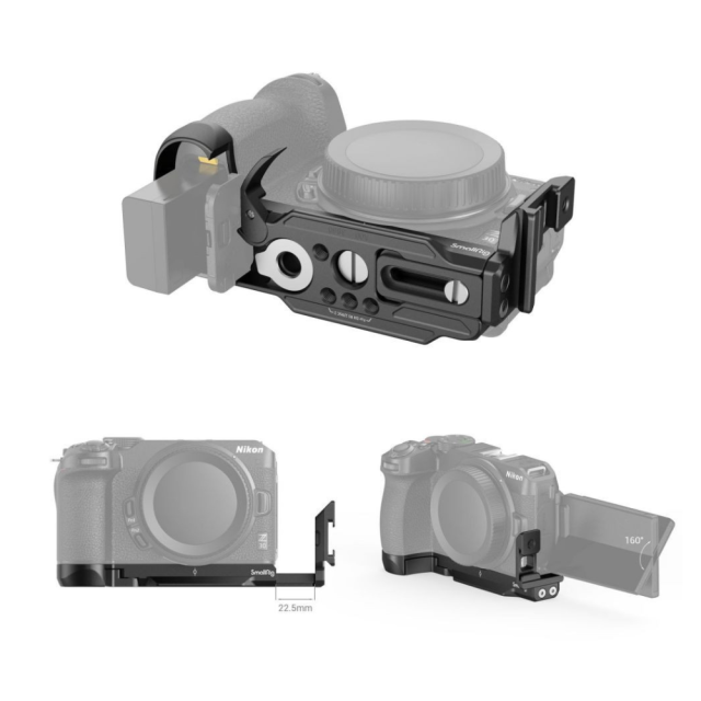 Die SmallRig L-Halterung für Nikon Z 30 3860 wurde entwickelt, um horizontale und vertikale Aufnahmen zu erleichtern und das Griffgefühl zu verbessern. Die L-Halterung wird mit einer 1/4"-20-Schraube an der Unterseite der Kamera befestigt und ist mit Polstern versehen, die Kratzer und Verdrehungen verhindern. Am Batteriefachdeckel befindet sich ein Scharnierarm, der sich der Kamerakurve anpasst, um einen bequemen Griff zu ermöglichen und den Batteriewechsel zu erleichtern. Sowohl die Grundplatte als auch die Seitenplatte verfügen über eine Arca-Swiss-Schnellwechselplatte für ein Arca-Swiss-Stativ für horizontale und vertikale Aufnahmen. Insbesondere die Seitenplatte kommt mit einem kalten Schuh Halterung für Mikrofon, LED-Licht und kann gestreckt werden, um Kabel durch und die Flip-Screen zu 160 ° zu drehen; Bottom 1/4 "-20 Gewindebohrungen für die Schnellwechselplatte (oben) von DJI RS 2 / RSC 2 / RS 3 / RS 3 Pro Stabilisator oder Stativ, Riemen Schlitze für Hand Strap 3848 und einen eingebauten Schlitzschraubendreher für die schnelle Freigabe von Zubehör.