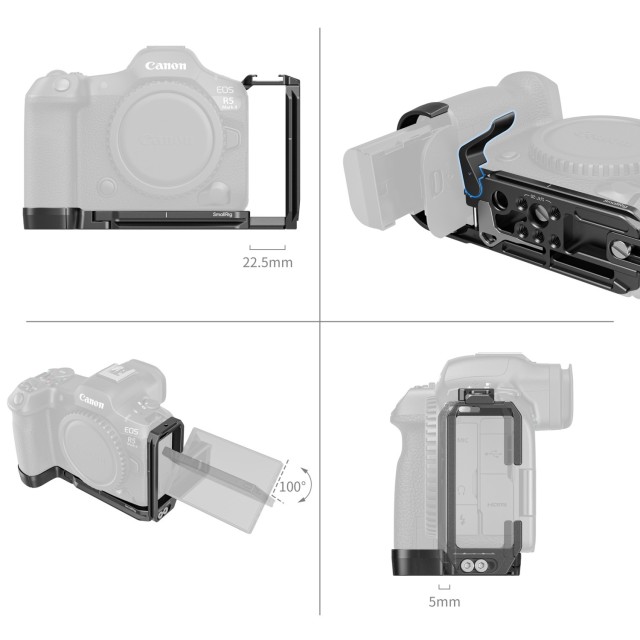 Die SmallRig L-Shape Montageplatte für Canon EOS R5 Mark II 4983 wurde entwickelt, um einen schnellen Wechsel zwischen Hoch- und Querformat zu ermöglichen und gleichzeitig die Griffigkeit des Kameragehäuses zu verbessern. Die L-förmige Montageplatte wird mit einer 1/4"-20 Schraube an der Basis und zwei Fixierblöcken an den Seiten fest mit der Kamera verbunden, um eine Abweichung zu verhindern. Sie verfügt über integrierte Silikonpads, um die Kamera vor Kratzern zu schützen.