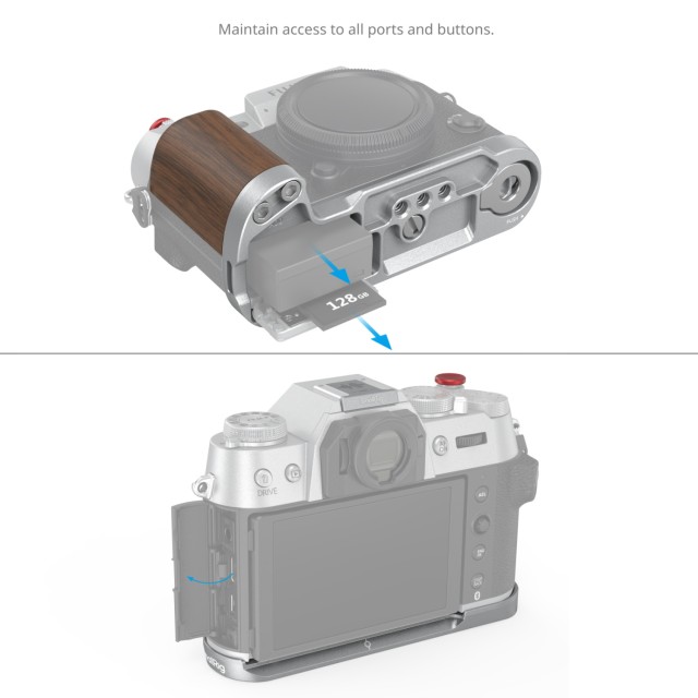 SmallRig L-Shape Montageplatte mit Griff für FUJIFILM X-T50 (Silber) 4735B wurde entwickelt, um den Griff der Kamera zu verbessern. Der L-Shape Grip wird mit einer 1/4"-20 Schraube an der Unterseite an der Kamera befestigt, und die eingebauten Silikonpads verhindern Kratzer. Der Handgriff besteht aus natürlichem Massivholz, das sich elegant und natürlich anfühlt, und ist ergonomisch gestaltet, um das Griffgefühl zu verbessern. Die integrierte Arca-Swiss-Schnellwechselplatte ermöglicht eine einfache und schnelle Montage und Demontage des Arca-Stativs.