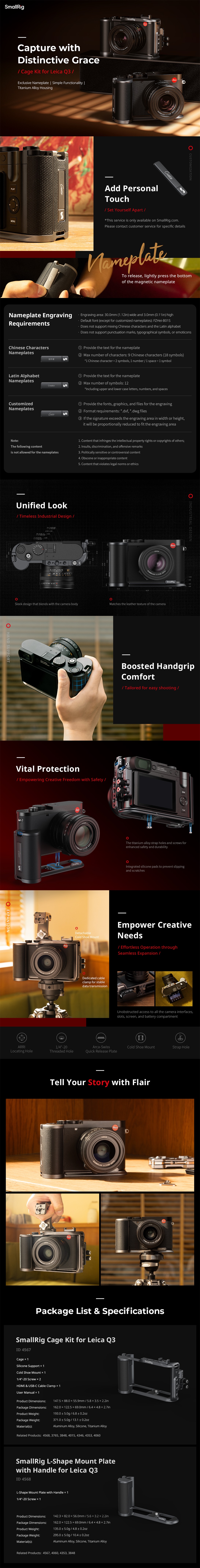 Die SmallRig L-Shape Montageplatte mit Griff für Leica Q3 4568 wurde entwickelt, um Ihren Kameragriff zu verbessern. Die L-förmige Montageplatte mit Griff wird an der Unterseite mit einer 1/4"-20 Schraube sicher befestigt und verfügt über mehrere integrierte Silikonpads, die Kratzer auf dem Kameragehäuse verhindern. Sie ist in der gleichen Struktur und Farbgebung wie das Kameragehäuse gehalten, um einen nahtlosen Sitz zu gewährleisten und gleichzeitig mit einem eingravierten Namensschild eine persönliche Note zu verleihen. Wichtige tragende Komponenten wie die beidseitigen Riemenlöcher und Schrauben sind aus einer haltbaren Titanlegierung gefertigt.