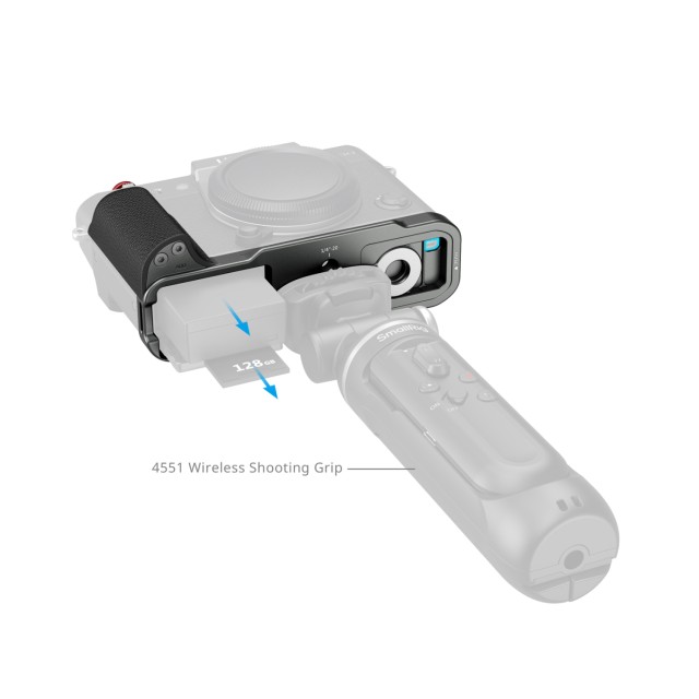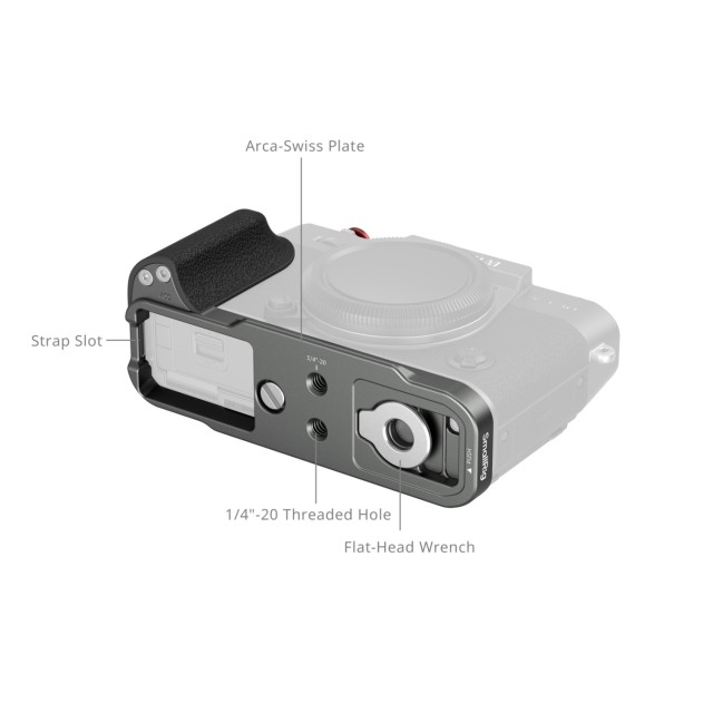 Der L-förmige Griff ermöglicht den uneingeschränkten Zugriff auf alle Kamera-Schnittstellen, einschließlich Batteriefach, Fokusring, Speicherkartensteckplatz und Lautsprecheranschlüsse. Dieses Gerät enthält außerdem einen Flachschlüssel für die einfache Montage und Demontage sowie eine Auslöserkappe, um das taktile Feedback während der Aufnahme zu verbessern.