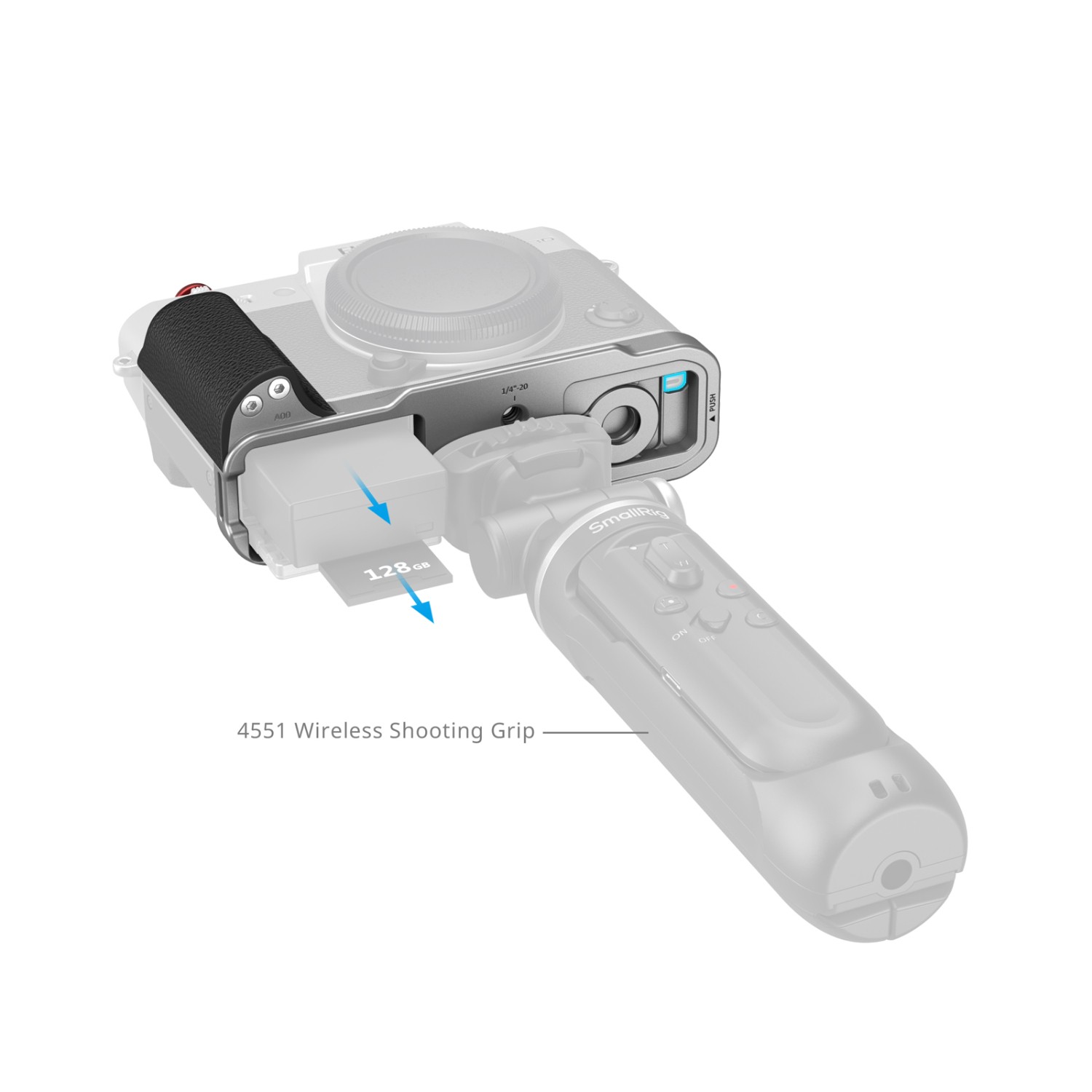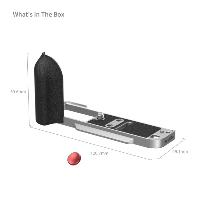 Der L-förmige Griff ermöglicht den uneingeschränkten Zugriff auf alle Kamera-Schnittstellen, einschließlich Batteriefach, Fokusring, Speicherkartensteckplatz und Lautsprecheranschlüsse. Dieses Gerät enthält außerdem einen Flachschlüssel für die einfache Montage und Demontage sowie eine Auslöserkappe, um das taktile Feedback während der Aufnahme zu verbessern.