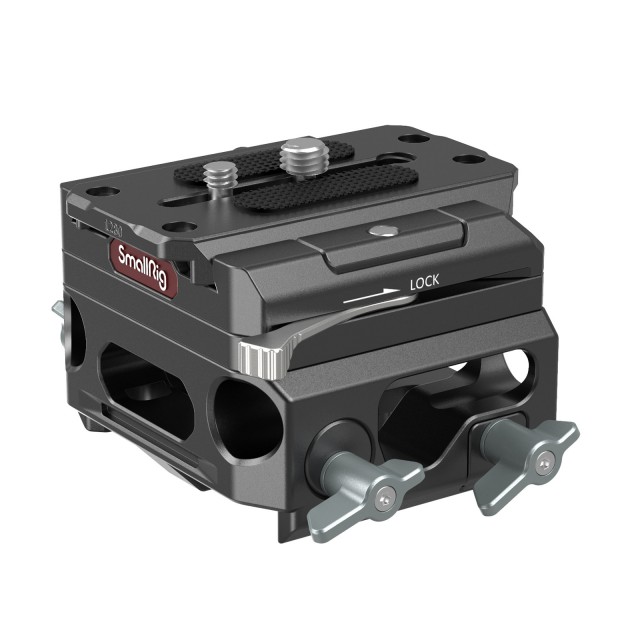 Die SmallRig Lightweight Baseplate mit Dual 15mm Rod Clamp (Magnesium Alloy Version) 3067 ist aus einer Magnesium-Aluminium-Legierung gefertigt, die ca. 40% leichter ist als eine herkömmliche Aluminium-Legierung. Er ist für die Verwendung mit dem Käfig aus der Magnesiumlegierung 3065 konzipiert, um sicherzustellen, dass der Abstand zwischen der Mitte des Objektivs und der Mitte der Stäbe 85 mm beträgt. Es wird mit einer abnehmbaren Unterlegscheibe geliefert, um die Höhe an die Bedürfnisse der Schützen anzupassen. Die Unterseite des 3067 verfügt über eine Standardschnittstelle für Arri-Schnellwechselplatten und mehrere 1/4"-20 und 3/8"-16-Gewindebohrungen, die eine schnelle Demontage und Montage ermöglichen und auf andere Schnellwechselplatten übertragen werden können. An der Oberseite befindet sich eine standardmäßige Manfrotto-Schnellwechselplatte, die eine schnelle Demontage und Montage des Geräts ermöglicht und auch einen schnellen Wechsel zu Aufnahmen mit einem Stabilisator ermöglicht.