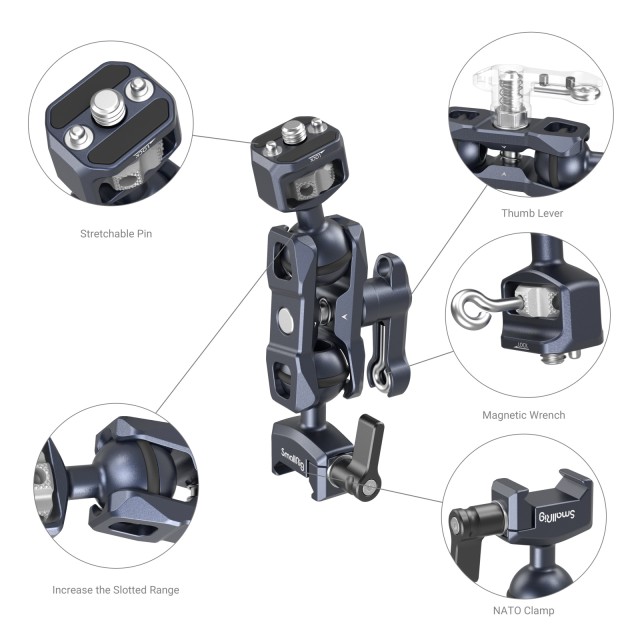 DerSmallRig Magic Arm mit zweiKugelköpfen (1/4"-20 Schraube und NATO-Klemme) 3875 ist kompakt und leicht. Beide Kugelköpfe haben einen Durchmesser von 20 mm, wobei der eine mit einer 1/4"-20 Schraube und dehnbaren Stiften ausgestattet ist, die ein Verdrehen verhindern, und der andere eine NATO-Klemme hat, die Käfig, Deckplatte usw. mit einer NATO-Schiene unterstützt. Der verstellbare Daumenhebel hilft dabei, den Kugelkopf in einem geeigneten Winkel zu fixieren, und wird mit einem kleinen Magnetschlüssel an der Unterseite geliefert, um die Daumenräder festzuziehen. An beiden Enden der Kugelkopfklemme befinden sich Aussparungen, die mehr Platz für die flexible Einstellung von Kugelköpfen sowie darauf montiertem Zubehör lassen. Dieser Artikel wiegt nur 91 g und ist daher leicht zu transportieren und zu verstauen.