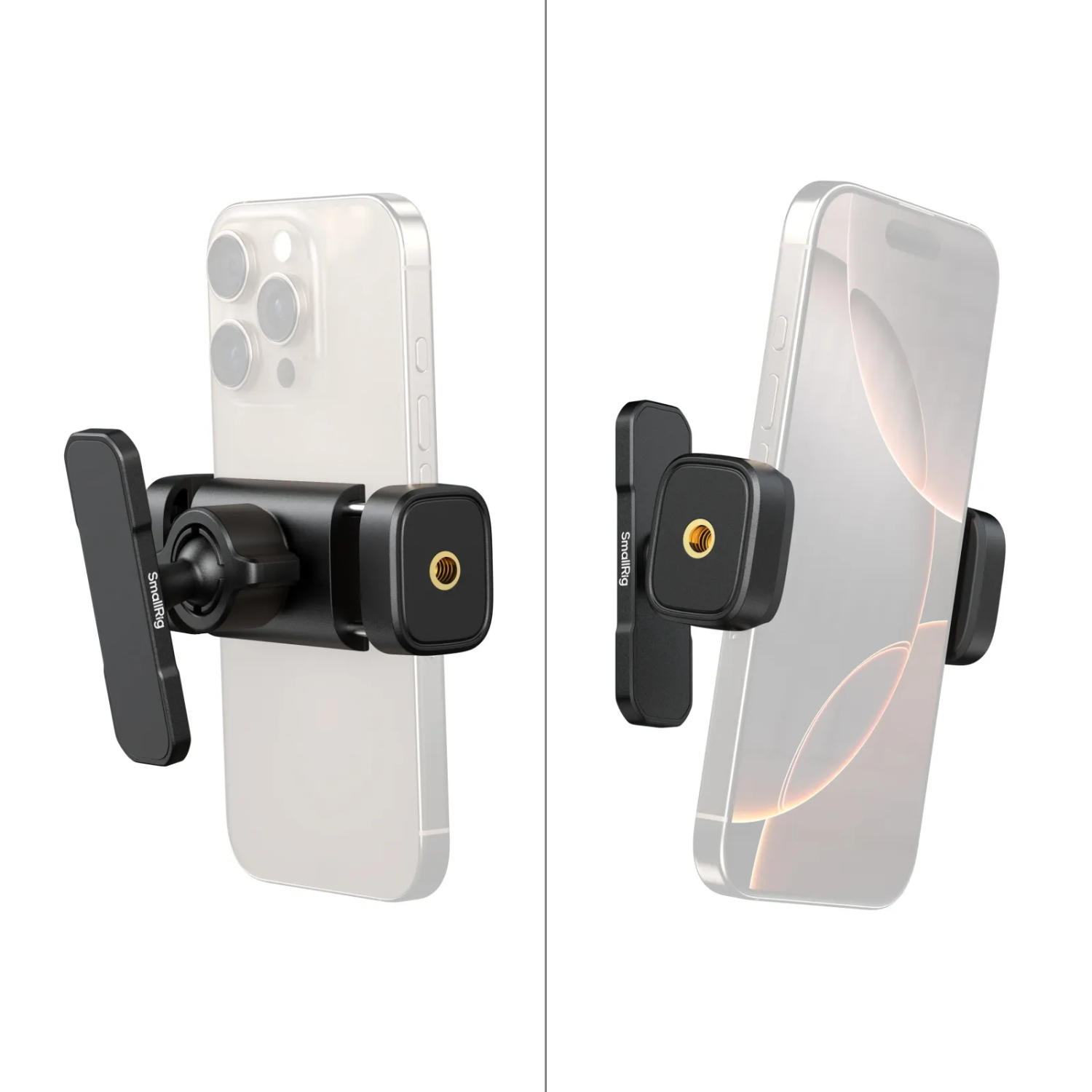 SmallRig Attachable Phone Clamp Support ist für Videoaufnahmen in Innenräumen konzipiert. Sie lässt sich sicher an flachen, eisenhaltigen Oberflächen befestigen (z. B. Fitnessgeräte, Eisenmöbel). Die magnetische Basis der Klasse N54 sorgt für eine stabile Verbindung. Die Telefonklemme eignet sich für Smartphones mit einer Breite von 55-105 mm (2,2-4,1") und einer Dicke von weniger als 15 mm (0,6") und unterstützt die iPhone-Modelle 12-16 sowie die meisten Android-Geräte. Der um 360° verstellbare Kugelkopf ermöglicht eine stufenlose Winkelanpassung für eine optimale Bildgestaltung.