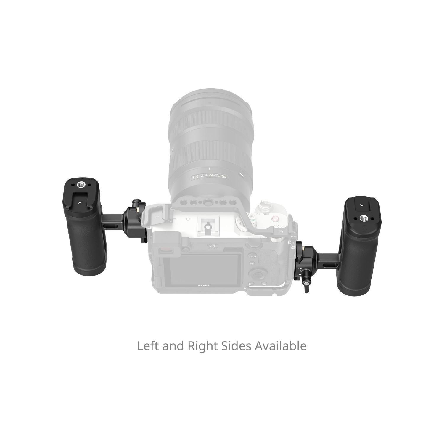 Der Seitengriff kann auf beiden Seiten des Käfigs montiert werden. Um die Seiten zu wechseln, lösen Sie den Aluminiumverbinder und konfigurieren Sie ihn auf der gegenüberliegenden Seite des Griffs neu. Er umfasst einen NATO-Klemmenverbinder und eine NATO-Schiene für die nahtlose Integration in verschiedene Kamerakäfige.