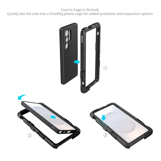 Die Seiten sind mit zwei Löchern für Handgelenk- und Schultergurte ausgestattet, die mit professionellen Gurten mit einem Durchmesser von weniger als 2 mm kompatibel sind, was die Tragbarkeit bei Drehpausen verbessert. Das hohl geschnittene Design bietet ungehinderten Zugang zu den Tasten des Telefons, den Anschlüssen, dem Stylus-Stift, dem Radar, den Ultra-Weitwinkel-Objektiven und dem drahtlosen Aufladen. Der Schnellverschlussmechanismus ermöglicht ein schnelles und sicheres Einsetzen und Herausnehmen des Telefons und verhindert ein versehentliches Auswerfen. Die Vollmetallkonstruktion bietet umfassenden Schutz, absorbiert Stöße und verhindert Kratzer.
