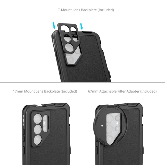 Das SmallRig Mobile Video Cage Kit für Samsung S25 Ultra 5254 ist eine vielseitige Lösung für professionelle Filmaufnahmen, Live-Streaming und Kurzfilmproduktion mit dem Samsung S25 Ultra. Das Kit umfasst eine Schutzhülle, einen Videokäfig, eine spezielle T-Mount-Rückplatte, eine 17-mm-Objektivrückplatte und eine magnetische Filterrückplatte. Die Handytasche bietet täglichen Schutz und kann entweder mit der T-Mount- oder 17-mm-Objektivrückplatte zum Anbringen externer Objektive oder mit der Magnetfilterrückplatte für 67-mm-Magnetfilter kombiniert werden, um eine hochwertige Videoproduktion zu gewährleisten.