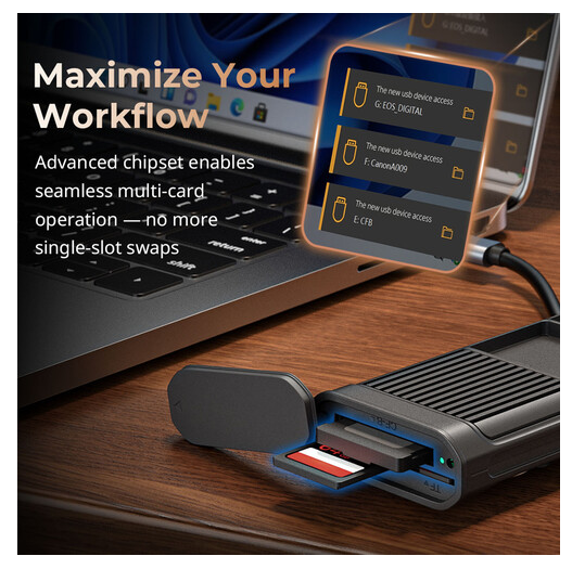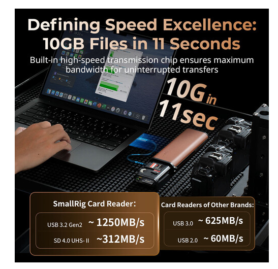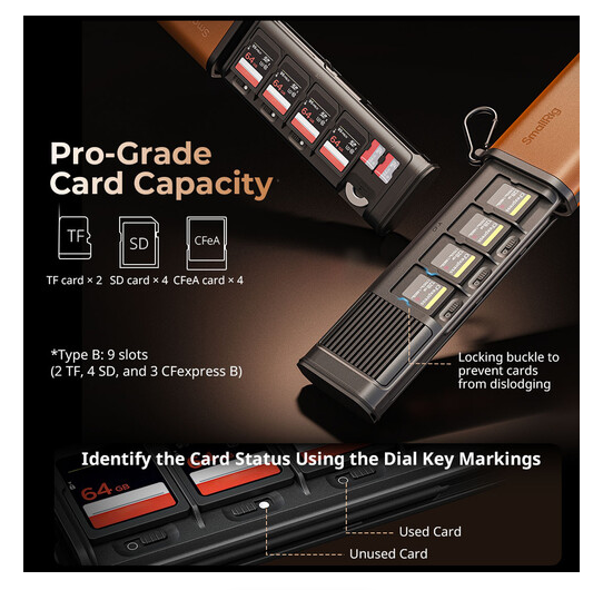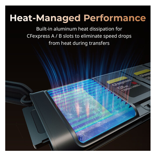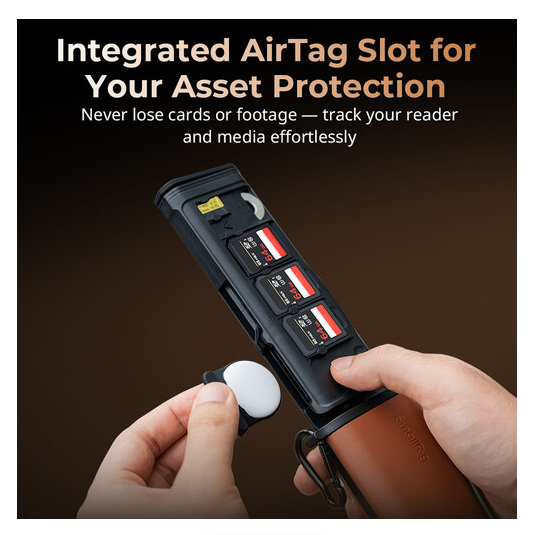 Übertragen Sie Daten mit rasanten Geschwindigkeiten von bis zu 1250 MB/s und speichern Sie bis zu neun Speicherkarten sicher mit dem multifunktionalen Kartenlesegerät und Aufbewahrungskoffer PGYTECH CFexpress Typ B. Er verfügt über simultane UHS-II SD/microSD- und CFexpress Typ B-Steckplätze, ein integriertes USB-C 3.2 Gen 2-Kabel mit Pass-Through-Ladefunktion, einen Aluminium-Kühlkörper für thermische Stabilität, IP54-Staub-/Spritzwasserschutz, einen AirTag-Steckplatz zur Ortung und eine robuste ABS/Aluminium-Konstruktion – alles in einem kompakten 235-g-Paket.