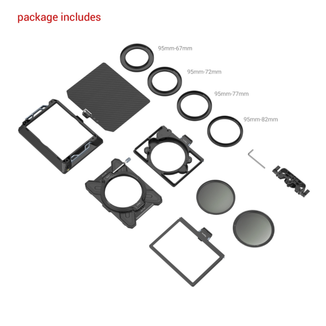 Der SmallRig Multifunktionale modulare Matte Box (Φ95 mm) VND Kit 3645 ist als einer der Matte Boxes der Star-Trail-Serie für spiegellose Kameras konzipiert, um zu verhindern, dass Sonnenlicht oder anderes Licht Reflexionen und Spiegelungen verursacht, und um das Bild auf dem Bildschirm zu kontrollieren. Für eine bestimmte Schärfentiefe hilft er, die Belichtung durch Veränderung des äußeren Lichtstroms auszugleichen. Das Set wird standardmäßig mit vier Gewindeadaptern (Φ67-95 mm / Φ72-95 mm / Φ77-95 mm / Φ82-95 mm) für Rundfilter wie VND, GND, CPL, gängige Objektive für digitale Spiegelreflexkameras und Kleinbildobjektive Φ95 mm, oder Sie können separat einen Satz Adapterringe (Φ52-95 mm / Φ55-95 mm / Φ58-95 mm / Φ62-95 mm / Φ86-95 mm) 3383 für eine größere Kompatibilität separat erwerben.