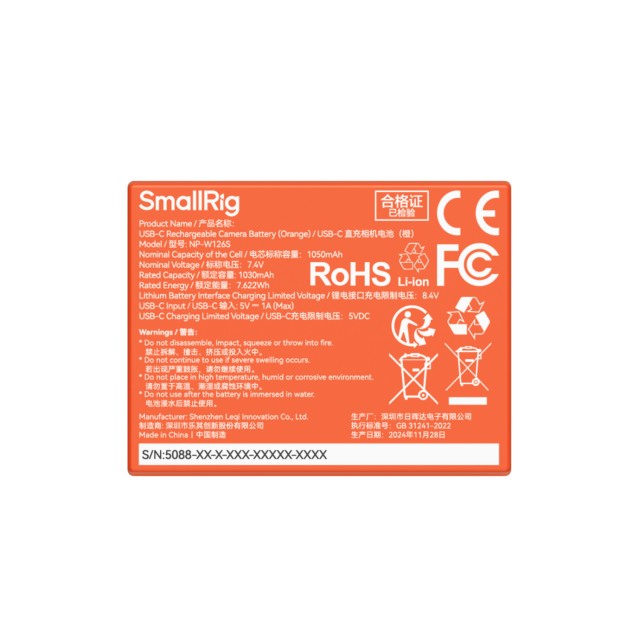 SmallRig NP-W126S USB-C Rechargeable Camera Battery (Orange) 5088 kann über eine Powerbank, eine Steckdosenleiste, ein Autoladegerät oder andere spezielle Ladegeräte aufgeladen werden. Mit Hochstromladung (5V 1A) und 1050mAh Nennkapazität können Sie den Akku in 2,5 Stunden voll machen und für eine längere Zeit laufen lassen. Dieser vollständig dekodierte Akku ohne Pop-ups verfügt über gefrostete ABS- und PC-Gehäuse, die feuerfest und langlebig sind. Er hat genau die gleiche Größe wie der Original-Kamera-Akku, sodass Sie sich keine Sorgen machen müssen, dass er stecken bleibt.