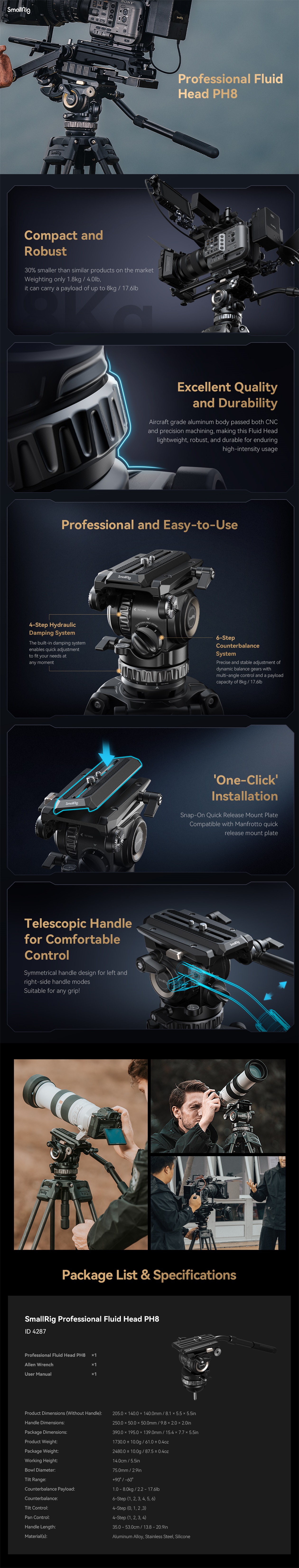 Der SmallRig Professional Fluid Head PH8 4287 ist ein professioneller Fluidkopf, der Videoaufnahmen erleichtert. Der Fluidkopf verfügt über ein einstellbares 6-stufiges Gegengewichtssystem. Wenn die Höhe des Gravitationszentrums 55 mm beträgt, gleicht das 6-stufige Ausgleichssystem die Kamera oder andere Rigs (bis zu 8 kg) aus und steuert die Kameraneigung präzise.