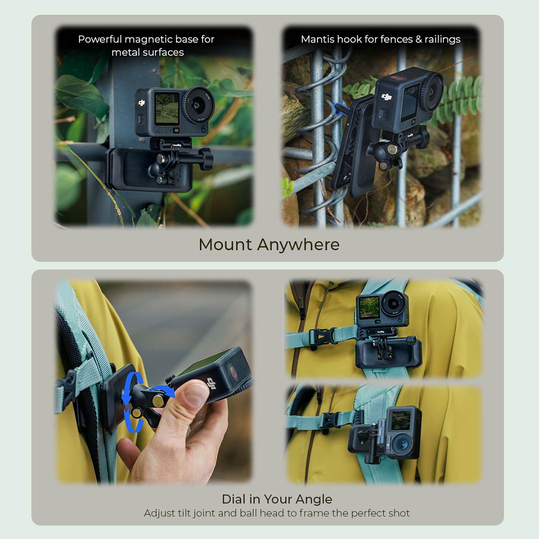 Er ist mit den meisten Action-Kameras auf dem Markt kompatibel und verfügt über eine Schnellverschluss-Schnittstelle zum sofortigen Anbringen und Abnehmen der Kamera, was die Aufnahmeeffizienz verbessert. Die Schnellverschlussbasis verfügt über eine Sicherheitsverriegelung, um ein versehentliches Entriegeln zu verhindern und einen sicheren Halt während der Bewegung zu gewährleisten.