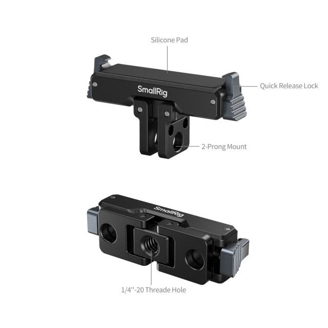 Die Basis ist mit einer klappbaren 2-Punkt-Halterung und einem 1/4"-20-Gewinde ausgestattet, was eine breite Kompatibilität mit SmallRig-Zubehör wie Saugnapfhaltern (ID 4235), Krabbenklammern (ID 4102B), Selfie-Sticks (ID 5403) und Halterungen für den Hals (ID 5126).