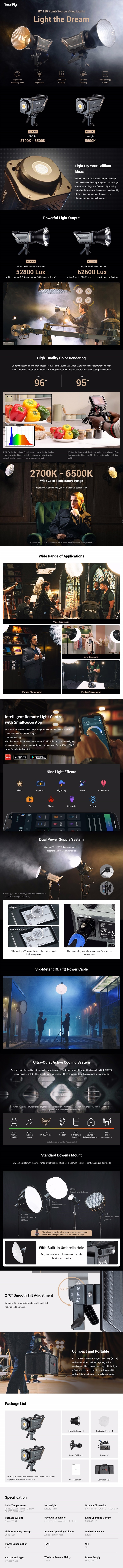 Der SmallRig RC120D (3612) repräsentiert die erste Generation der professionellen SmallRig Studio-LED-Leuchten. Sie nutzt die fortschrittliche COB (Chip-On-Board)-LED-Technologie für eine hohe Intensität (5.370 Lux) sowie einen hocheffizienten Reflektor, um bis zu 62.600 Lux in der Mitte des Lumen bei einer Entfernung von 1 m zu erreichen. Darüber hinaus bietet sie eine hohe Farbgenauigkeit (CRI 95+, TLCI 96+), ein Bowens-Bajonett für die einfache Montage von Standardzubehör (Softboxen usw.) und neun integrierte Effekte (Paparazzi, Feuerwerk, Blitz, Fault Bulb, TV, Atem, Blitz, Party, Flamme), die sowohl manuell als auch drahtlos über die SmallGoGo-App gesteuert werden können, sowie eine stufenlose Intensitätseinstellung. Die Variante RC120D hat eine feste Farbtemperatur von 5600K (+/- 200K) und eine maximale Lichtstärke von 5.370 lx bzw. 62.600 lx mit montiertem Reflektor.