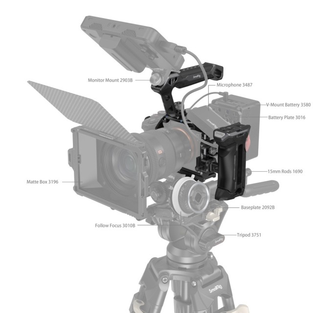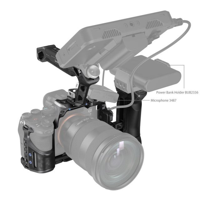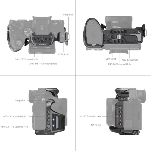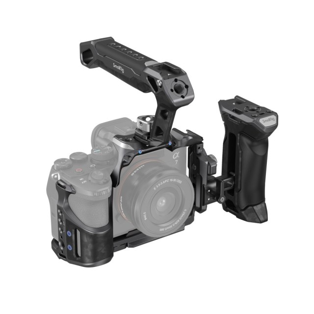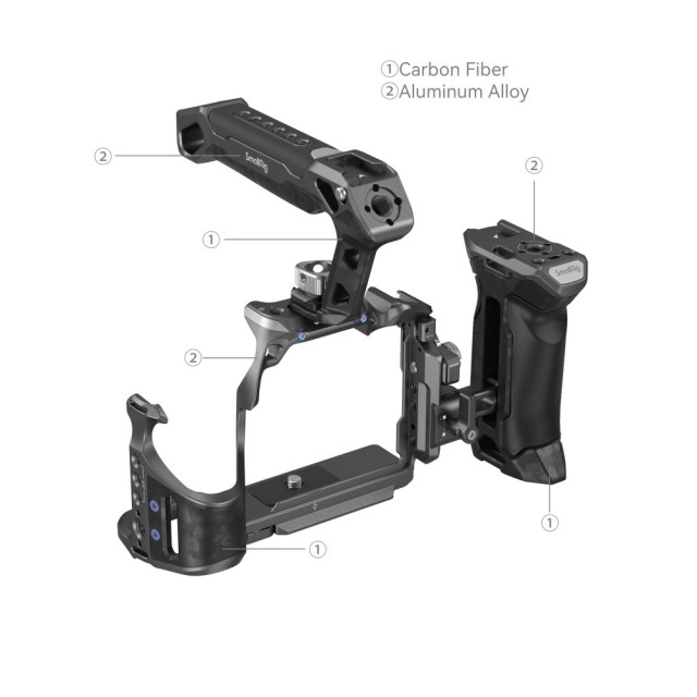 Das SmallRig "Rhinoceros" Advanced Cage Kit für Sony Alpha 7R V / Alpha 7 IV / Alpha 7S III 3710 wurde entwickelt, um die Belastung der Arme zu reduzieren, die Stabilität zu erhöhen und Befestigungspunkte für Zubehör bereitzustellen. Das Kit umfasst einen Käfig, einen oberen Griff, einen seitlichen Griff und eine HDMI-Kabelklemme. Der Käfig und die beiden Griffe sind tragbar, da sie aus leichterer Kohlefaser bestehen und somit länger in der Hand gehalten werden können. Der Käfig ist mit einem Fixierstift, einer 1/4"-20 Schraube und einer M2,5 Schraube ausgestattet, die zusammen die Kamera fest verriegeln. Die Kamera verfügt über ein klares, stromlinienförmiges Design, das den vollen Zugriff auf die oberen Tasten ermöglicht. Der obere Griff liegt bequem in der Hand und ermöglicht Aufnahmen aus einem niedrigen Winkel; der seitliche Griff aus leichter Kohlefaser und PU-Leder sorgt für einen angenehmen und festen Halt. und die HDMI-Kabelklemme, die mit einer Flachkopfschraube festgezogen wird, schützt die Schnittstellen und gewährleistet eine stabile Signalübertragung. Zum Lieferumfang gehören außerdem 1/4"-20-Gewindebohrungen für den Magic Arm 3873, Kaltlichthalterungen für das Mikrofon und die LED-Videoleuchte sowie ARRI 3/8"-16-Aufnahmebohrungen für den Side Handle 2914. Eine NATO-Schiene und eine Arca-Swiss-Schnellwechselplatte erweitern die Vielseitigkeit des Käfigs. Insbesondere die Arca-Swiss-Platte ermöglicht einen schnellen Wechsel zwischen Handheld-, Stativ- und Gimbal-Modus (DJI RS 2 / RSC 2 / RS 3 / RS 3 Pro).