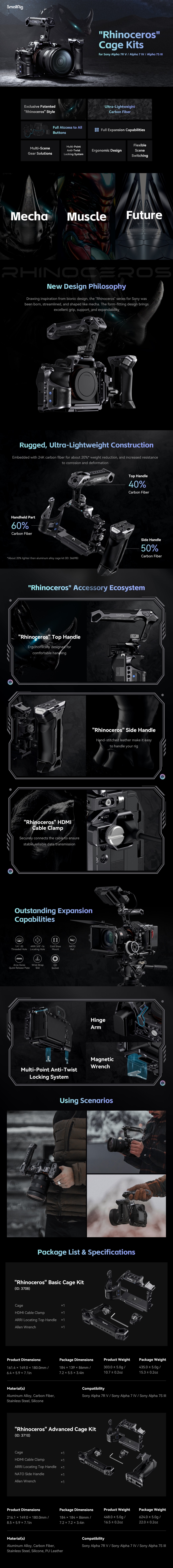Das SmallRig "Rhinoceros" Basic Cage Kit für Sony Alpha 7R V / Alpha 7 IV / Alpha 7S III 3708 wurde entwickelt, um Aufnahmen aus niedrigen Winkeln zu erleichtern, die Kamera zu schützen und Befestigungspunkte für Zubehör bereitzustellen. Das Kit umfasst einen Käfig, einen oberen Griff und eine HDMI-Kabelklemme. Sowohl der Käfig als auch der obere Handgriff sind tragbar, da sie aus leichterer Kohlefaser gefertigt sind, was längere Aufnahmen aus der Hand ermöglicht. Beim Käfig sorgen ein Fixierstift, eine 1/4"-20-Schraube und eine M2,5-Schraube zusammen für eine sichere Befestigung der Kamera. Die Kamera verfügt über ein klares, stromlinienförmiges Design, das den vollen Zugriff auf die oberen Tasten ermöglicht.