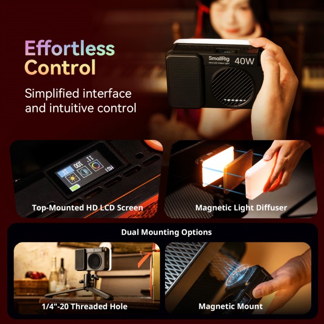 Die SmallRig RM 40C ist eine leistungsstarke 40-W-RGBWW-Mini-LED-Leuchte. Sie ist kompakt und dennoch leistungsstark und verfügt über eine verlängerte Betriebsdauer von 55 Minuten sowie eine Vollfarb-RGB-Beleuchtung für eine breitere Farbtemperatur- und Farbumfangsteuerung. Mit ihrer benutzerfreundlichen Bedienung, der magnetischen Befestigung und der PD-Schnellladefunktion ist sie perfekt für kreative Menschen, die viel unterwegs sind.