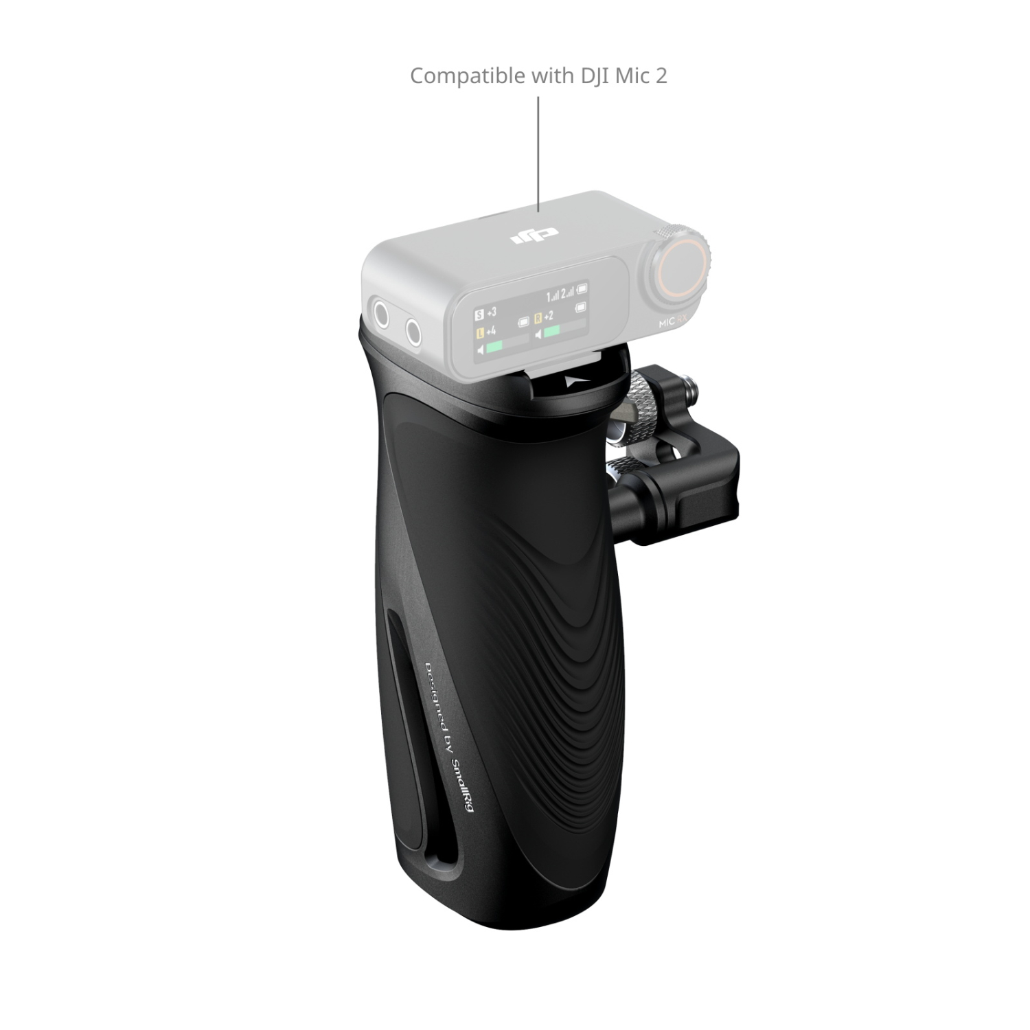 Der drehbare Seitengriff mit 1/4"-20 Schrauben 5194 lässt sich mit einem Tastendruck um 360° drehen und ermöglicht so eine reibungslose Winkelverstellung während der Aufnahme. Er bietet vielseitige Erweiterungsmöglichkeiten durch mehrere Montageschnittstellen, darunter 1/4"-20-Aufnahmebohrungen für Fernsteuerungen (ID 3902) und Magic Arms (ID 3873) sowie eine Kaltschuhhalterung für Zubehör wie Monitorhalterungen (ID 2905B), Mikrofone (ID 3487), Videoleuchten (ID 3286B) und das DJI Mic 2.