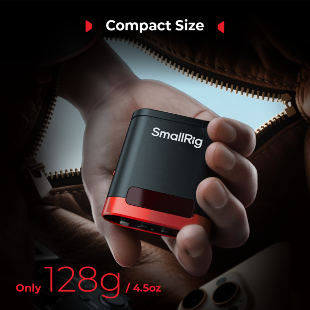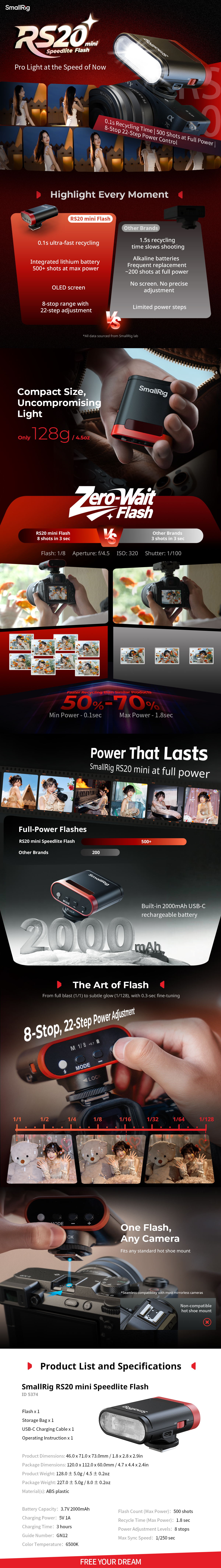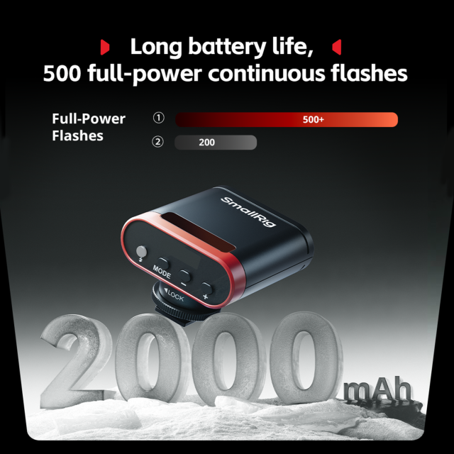SmallRig RS20 mini Speedlite Flash ist ein tragbares Blitzlicht im Taschenformat. Es ist handtellergroß und leicht (nur 100 g) und daher leicht zu transportieren. Ausgestattet mit einem integrierten Lithium-Akku mit hoher Kapazität von 2000 mAh, der über USB-C aufgeladen werden kann. Unterstützt bis zu 500 Blitze bei voller Leistung und bis zu 10000 Blitze bei der längsten Ausdauer, um längere Aufnahmesessions zu gewährleisten.