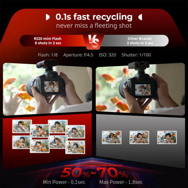 8. Die schnelle Wiederaufladezeit von 0,1s bis 1,8s ermöglicht effiziente Serienaufnahmen und eine anhaltende Blitzleistung.