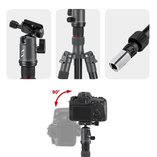 SmallRig Selection Tragbares Aluminium-Kamerastativ PT10 3257 ist aus einer Aluminiumlegierung gefertigt und hat eine Tragfähigkeit von 8 kg. Das Stativ unterstützt DSLRs, spiegellose Kameras usw. Seine fünfteiligen, durch Drehverschlüsse gesicherten Beine ermöglichen eine maximale Arbeitshöhe von 1445 mm und eine ausgezeichnete Stabilität. Das Stativ lässt sich in umgekehrter Richtung zusammenklappen, so dass die Länge im zusammengeklappten Zustand nur 325 mm beträgt und es leicht zu transportieren ist. Die zweiteilige, umkehrbare Mittelsäule ermöglicht Aufnahmen aus niedrigen Winkeln und Makroaufnahmen. Ein abnehmbares Einbeinstativ sorgt für große Flexibilität. Das Stativ wird mit einem Kugelkopf für Panoramaaufnahmen und einer Arca-Swiss-Schnellwechselplatte geliefert, die einen schnellen Wechsel zwischen Hand- und Stativaufnahmen ermöglicht.