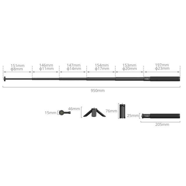 SmallRig Selfie Stick für Action-Kameras 5403 umfasst einen Selfie-Stick, eine Smartphone-Klemme, eine Action-Kamera-Halterung, ein Stativ und eine Handschlaufe. Hergestellt aus einer Aluminiumlegierung in Flugzeugqualität für erhöhte Robustheit und Langlebigkeit, verfügt dieser Artikel über sechseckige, ausziehbare Abschnitte, damit sich die Action-Kamera nicht verdreht, was zu mehr Stabilität führt. Der bis zu 95 cm ausziehbare und auf nur 20 cm zusammenklappbare Stick im Taschenformat wird mit zahlreichem Zubehör zur Unterstützung von Smartphones und Action-Kameras geliefert, wie z. B. GoPro HERO13 Black, insta360 X5, DJI Action 5 Pro, AKASO. Insbesondere bei der Verwendung von insta360 X4 können Sie den Stick von Ihren Fotos und Videos entfernen. Die Handgelenkschlaufe sorgt dafür, dass der Stick und die Kamera sicher an Ihrem Handgelenk befestigt werden können. Das Stativ mit einer 1/4"-20 Schraube an der Oberseite kann über das untere 1/4"-20 Gewindeloch an den Stick angeschlossen werden, um Gruppenfotos, feste Aufnahmen usw. zu machen.