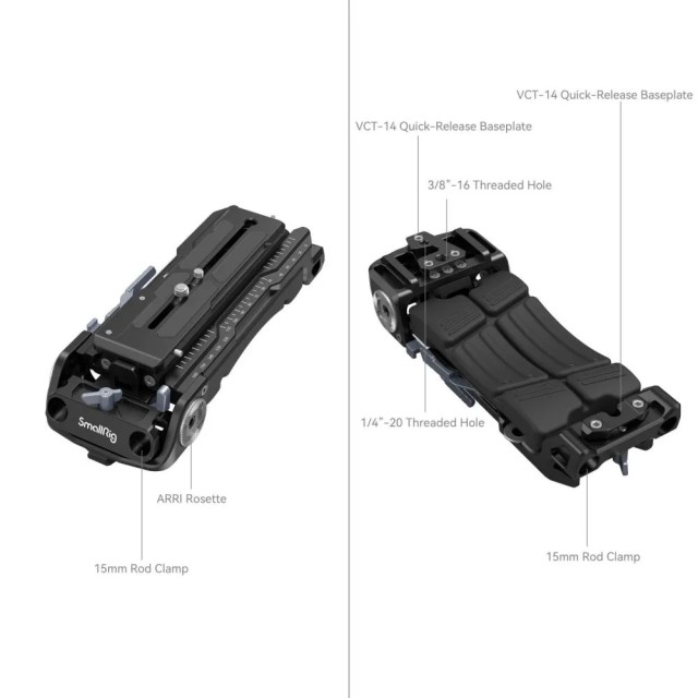 Universal Shoulder Rig (Kompatibel mit Sony VCT-14 Platte) 2837C ist für die Sony VCT-14 Schnellwechselplatte konzipiert. Es besteht aus einer SmallRig-Schnellwechselplatte an der Oberseite, an der die Kamera befestigt wird, und einer Manfrotto 501-Schnellwechselplatte, die ein Schulterpolster verbindet. der 2837B ermöglicht einen schnellen Wechsel zwischen Schulteraufnahmen, Handaufnahmen und Stativaufnahmen. Es verfügt auf beiden Seiten über eine Standard-M6-ARRI-Rosettenhalterung, die mit dem Original-Steuergriff von 1810- oder FX9-Maschinen kompatibel ist, sowie über zwei Stangensysteme am vorderen und hinteren Ende mit 15 mm Durchmesser und 60 mm Abstand. Insbesondere kann die vordere Stangenklemme vertikal um 27 mm verstellt werden, um einen Abstand von 85 mm zwischen Objektivmitte und Stangenmitte für Kameras wie FX9, FS5, URSA MINI, CANON C300 usw. zu gewährleisten. der 2837B hilft Ihnen auch, Ihre Kamera auf Ihrer Schulter oder Ihrem Rig auszubalancieren und das Follow Focus System und die Matte Box zu installieren, dank der eingebauten Manfrotto 501 Schnellwechselplatte, die sich um 0-80mm nach vorne verschieben lässt, und der SmallRig Schnellwechselplatte, die sich um 0-120mm nach hinten verschieben lässt. Sie müssen nicht erst das Follow-Focus-System oder die Matte-Box entfernen, da das vordere Stangensystem mit der Manfrotto 501 Platte zusammenpasst. Weitere Merkmale des 2837B sind die 1/4"-20-Gewindebohrungen und 3/8"-16-Gewindebohrungen in der V-förmigen Bodenplatte, die verschiedene andere Schnellwechselplatten und Stative unterstützen. Der Artikel wird mit einem neuen Silikon-Schulterpolster geliefert, das ergonomisch geformt ist, damit sich die menschlichen Schultern weich und bequem anfühlen. Darüber hinaus gibt es einen eingebauten flachen Schraubenschlüssel für einfachen Zugang.