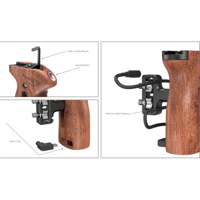 Der seitliche SmallRig-Gewindegriff des 3323 mit ferngesteuertem Start-/Stopp-Auslöser ermöglicht eine bequeme Start-/Stoppsteuerung für stabile und komfortable Aufnahmen. Der ergonomisch geformte All-in-One-Holzgriff verbessert das Halteerlebnis. Wird mit zwei 1/4"-20-Gewinden und verstellbarer Höhe sicher am Käfig befestigt. Auf der Oberseite befinden sich Gewindebohrungen mit 1/4"-20 und 3/8"-16 und ein Kaltgeräteschuh für die Monitorhalterungen 2904 und 2905; ein eingebauter Schraubenschlüssel ermöglicht das einfache Entfernen und Anbringen von Zubehör. Es ist mit drei Steuerkabeln ausgestattet, die Sony A7II/A7III/A6000/A6500, FUJIFILM X-T3/X-T4, Panasonic GH5/5S/G9/G95/S5/S1/S1R/S1/BGH1 und Z CAM E2/M4/S6 Kameras unterstützen. Ergänzen Sie das Schulterset für Sony-Kameras um das längere Steuerkabel ID:3407, das separat erhältlich ist.