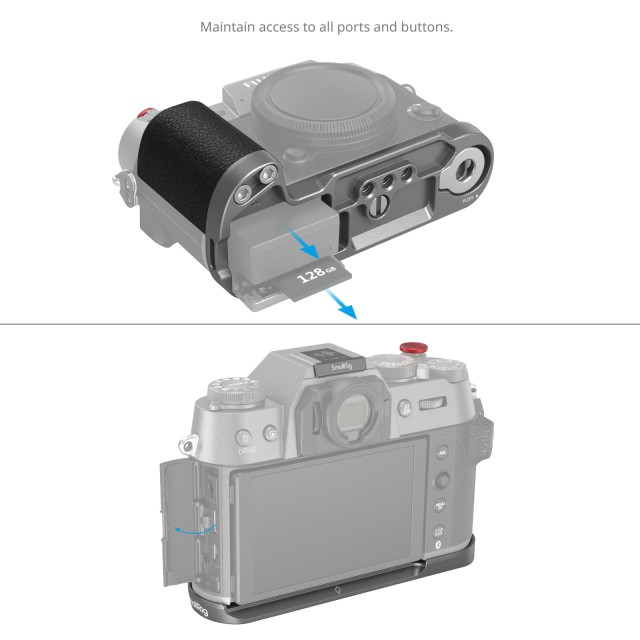 SmallRig Silicone L-Shape Grip für FUJIFILM X-T50 (Charcoal Silver) 4712 wurde entwickelt, um den Griff der Kamera zu verbessern. Der L-förmige Griff wird mit einer 1/4"-20 Schraube an der Unterseite der Kamera befestigt, und die eingebauten Silikonpolster verhindern Kratzer. Die Textur und Farbe des Griffs passen perfekt zur FUJIFILM X-T50. Die integrierte Arca-Swiss-Schnellwechselplatte ermöglicht eine einfache und schnelle Montage und Demontage des Arca-Stativs. Vier 1/4"-20 Gewindelöcher an der Unterseite zur Befestigung von Manfrotto-Platten und Stativen. Riemenschlitz für Handgelenkriemen (ID: 3848). Der eingebaute Flachschlüssel an der Unterseite erleichtert die Montage und Demontage von Zubehör. Der Griff wird mit einer exklusiven Blitzschuhabdeckung geliefert, auf der als Hommage an FUJIFILM die Schallwelle "FUJIFILM" und das Gründungsjahr aufgedruckt sind. Außerdem ist er mit einem Auslöser ausgestattet, der ein weiches und bequemes Anfassen ermöglicht.
