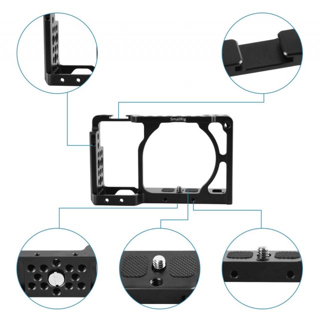 Der SmallRig Sony A6000/A6300/A6500 ILCE-6000/ILCE-6300/ILCE-A6500/Nex-7 Cage 1661 ist ein Aluminiumkäfig, der Ihre Kamera schützt und Befestigungsmöglichkeiten für Zubehör bietet.
