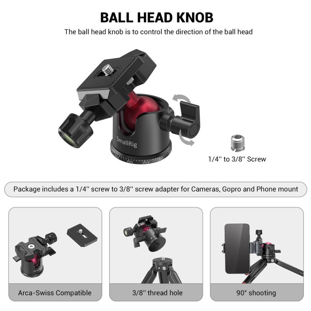 SmallRig Tabletop Mini-Stativ mit Panoramakugelkopf BUT2664 ist das perfekte Mini-Stativ für kompakte DSLRs, spiegellose Kameras, Smartphones, Action-Kameras und andere Geräte und kann auch als Griff für handgeführte Aufnahmen dienen. Das Stativ ohne Kugelkopf ist bis zu 20 kg belastbar, während der Kugelkopf selbst bis zu 2 kg tragen kann. Es ist solide und sicher, und die Gummifüße garantieren einen stabilen und rutschfreien Stand auf jeder Oberfläche. Der Kugelkopf mit präziser Kalibrierung unterstützt eine 360°-Panoramadrehung für Panoramaaufnahmen, eine Neigung von -90°/+45° nach vorne und eine seitliche Neigung von -50°/+50° für die Einstellung von mehreren Winkeln, einschließlich horizontaler und vertikaler Aufnahmen. Er wird mit einer Standard-Arca-Swiss-Platte geliefert, die mit anderen Arca-Swiss-Klemmen kompatibel ist, um eine schnelle Montage/Demontage Ihres Geräts zu gewährleisten.