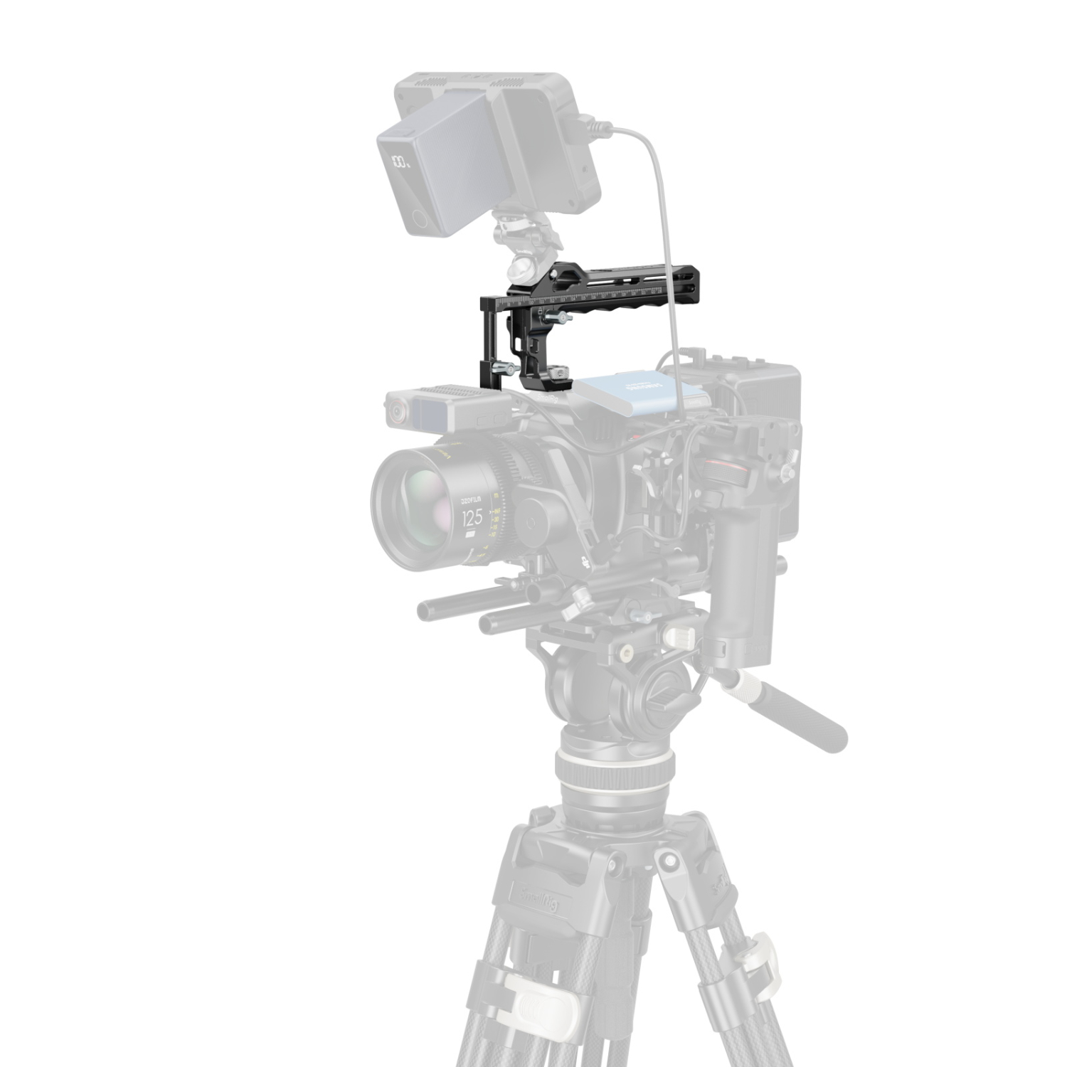 Der ergonomisch gestaltete Griff verfügt über einen komfortablen Griff mit eingebettetem Silikon für rutschfeste und kälteresistente Leistung. Er ist mit zwei Kaltlichthalterungen an der Vorderseite und zwei an der Rückseite ausgestattet, an denen gleichzeitig Zubehör wie Mikrofone, Videoleuchten oder Monitore befestigt werden können. Die ARRI-Positionierungslöcher an der Vorder- und Oberseite ermöglichen die Anbringung von Monitorhalterungen (ID 2903B) zur Erweiterung von Monitoren, während mehrere 1/4"-20-Gewindebohrungen und Positionierungslöcher an der Ober- und der rechten Seite mit Magic Arms (ID 4194, 4900) zur Monitorbefestigung oder Fernbedienungen (ID 3902) zur Steuerung von Kameraaufnahmen kompatibel sind.