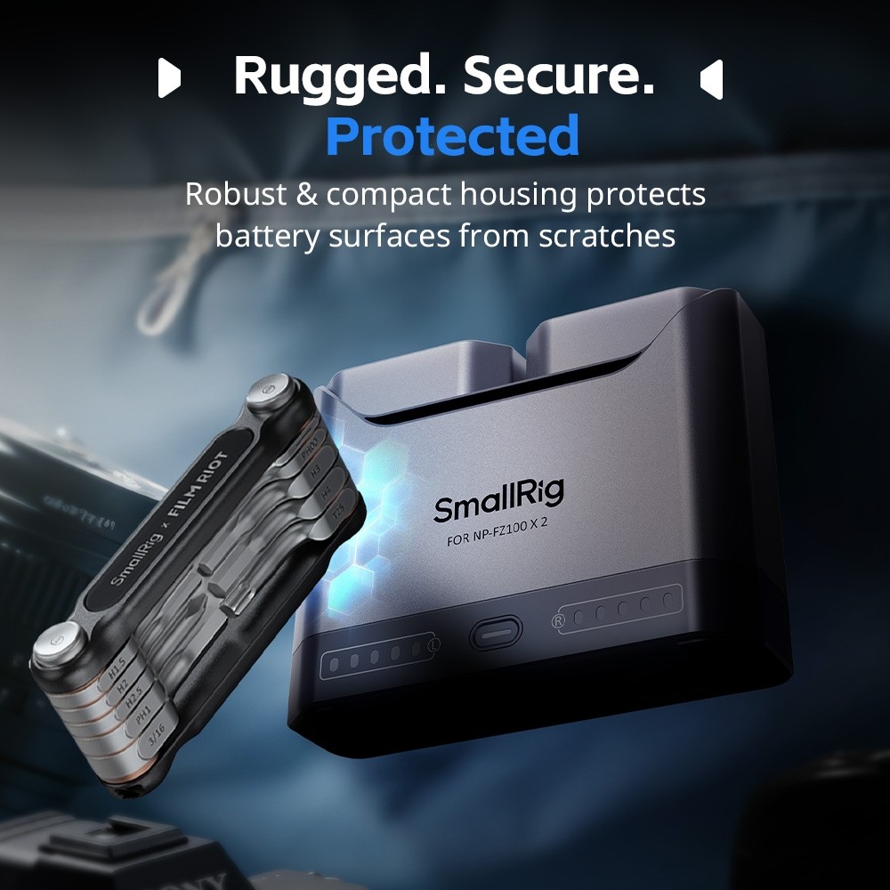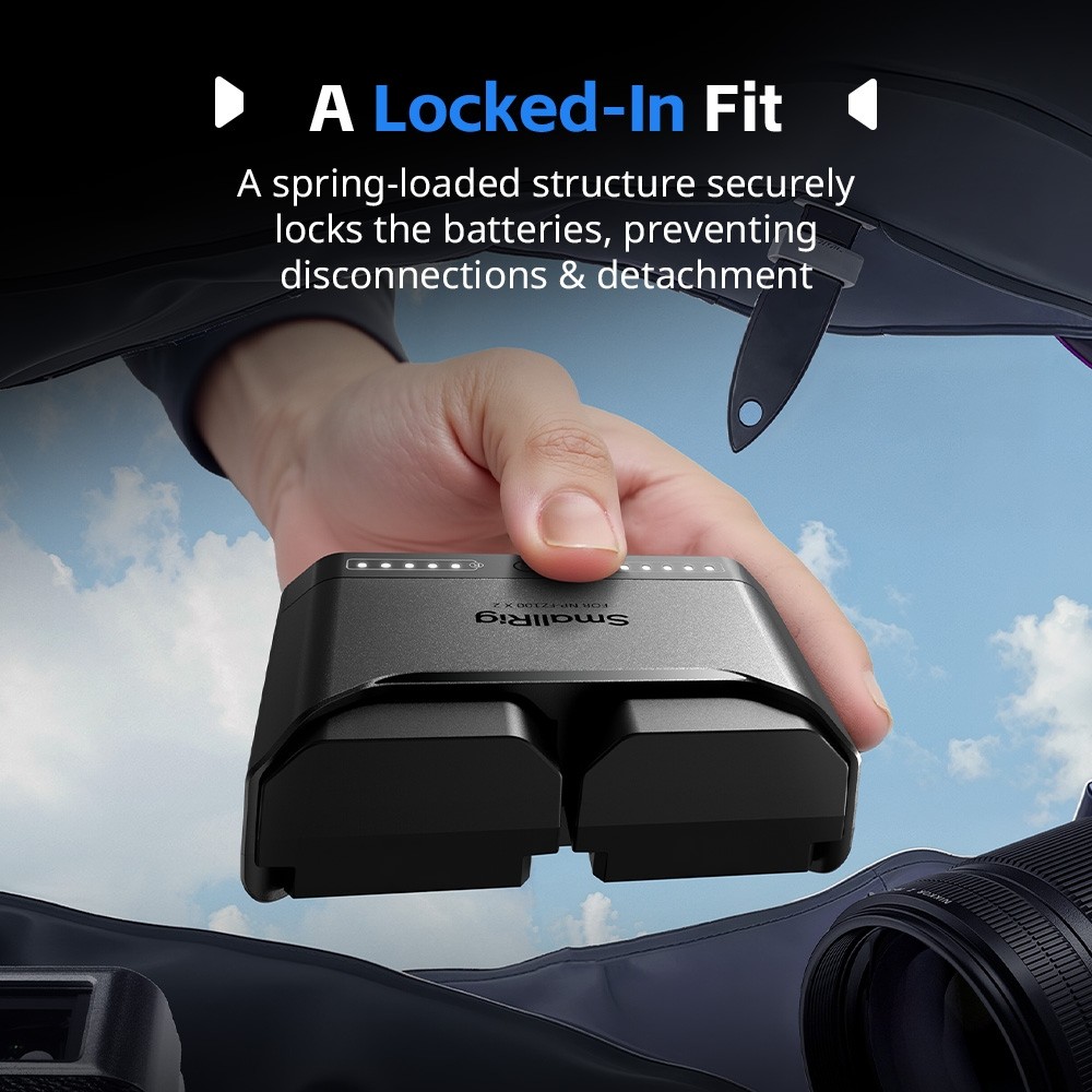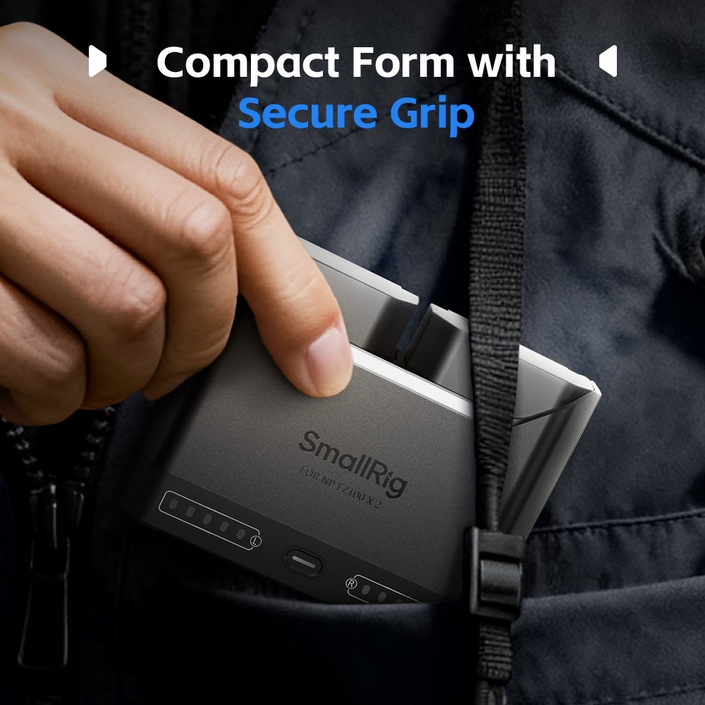Jeder Akku liefert eine Nennleistung von 1030 mAh und ermöglicht so eine längere Aufnahmezeit für anspruchsvolle Arbeitsabläufe. Das Dual-Slot-Design des Ladegeräts ermöglicht das gleichzeitige Laden von zwei Akkus oder das Laden eines einzelnen Akkus und lädt zwei Akkus in etwa 1,5 Stunden vollständig auf, was eine optimale Effizienz gewährleistet.