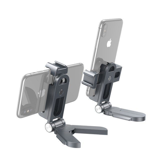 Sie verfügt über einen Kaltlichtschuh und 1/4"-20, um die Montage von verschiedenem Zubehör zu ermöglichen. Die Arca-Swiss-kompatible Grundplatte lässt sich an einem Arca-Stativ befestigen und kann auch als Handgriff für Aufnahmen aus der Hand verwendet werden. Die Halterung kann als Smartphone-Ständer verwendet werden, indem die Grundplatte nach beiden Seiten geöffnet wird. Er kann um 360 Grad gedreht und um 270 Grad geneigt werden und lässt sich zusammenklappen und in einer Tasche verstauen. Integrierte Gummipuffer schützen Ihr Telefon vor Kratzern.