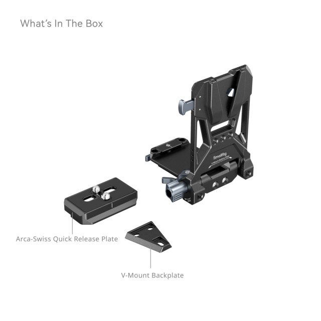 Die SmallRig V-Mount-Batteriehalterungsplatte 4505B ist eine kompakte, leichte und praktische All-in-One-Befestigungslösung für V-Mount-Batterien. Die Grundplatte kann gedehnt werden, um spiegellosen Kameras und DSLR-Kameras verschiedener Größen zu passen. Die werkzeuglose Installation und Einstellung machen den Vorgang schnell und zeitsparend. Die integrierte Arca-Halterungsplatte unterstützt alle SmallRig-Käfige mit einer Arca-Swiss-Platte.