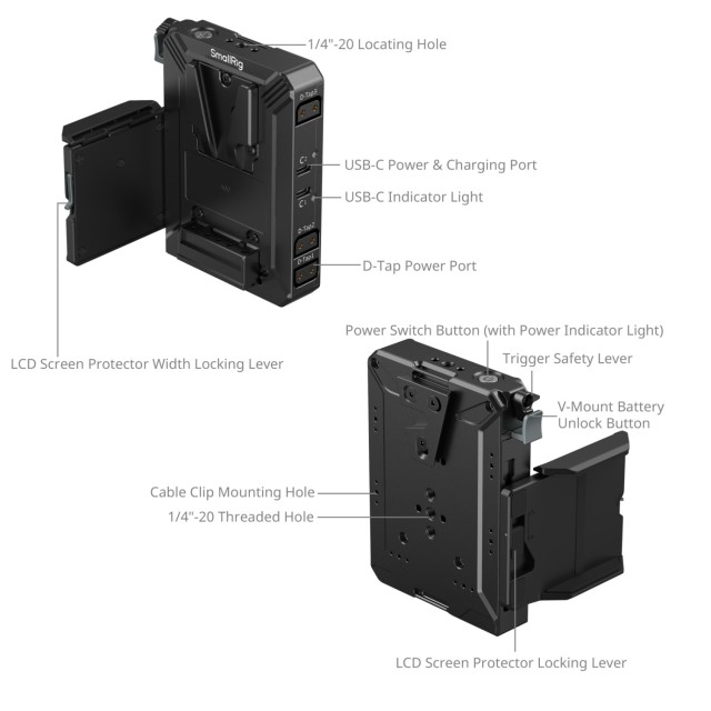 Die SmallRig V-Mount-Batteriehalterungsplatte bietet eine optimierte Lösung für die Integration von V-Mount-Batterien in Ihr Kamerarig. Dieses System wurde für den schnellen Einsatz von Batterien und die Stromverteilung an mehrere Geräte entwickelt und umfasst eine V-Mount-Batterieplatte und einen modularen LCD-Bildschirmschutz. Die Platte lässt sich sicher an kompatiblen Rigs befestigen und ermöglicht einen schnellen Batteriewechsel sowie eine unterbrechungsfreie Stromversorgung.