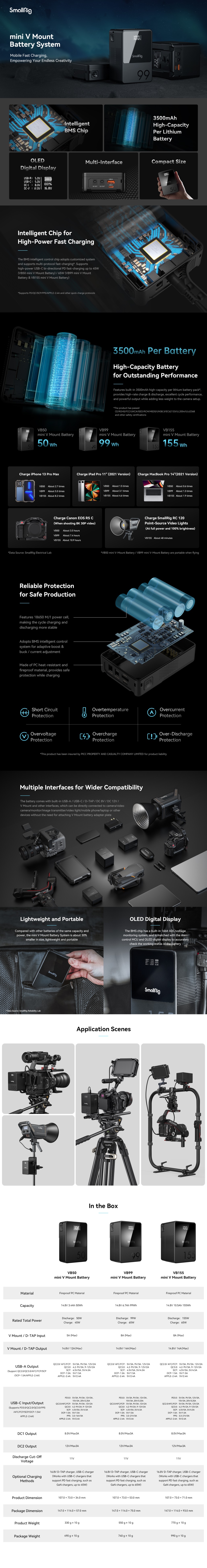 VB155 ist etwa 70 % kleiner als ein normaler V-Mount-Akku, da das hochintegrierte Design weniger Platz einnimmt, wodurch es leichter und tragbarer wird! Der hochintegrierte (Schnellladeprotokoll-Chip + MCU + Spannungserhöhungssteuerung) BMS-Chip unterstützt eine breite Palette von Mainstream-Schnellladeprotokollen (PD / QC / SCP / PPS / APPLE-2.4A usw.), bidirektionales 65W (Max) USB-C PD-Schnellladen sowie adaptive Spannungserhöhung/ adaptive Stromregelung usw.! Darüber hinaus sorgt das maßgeschneiderte intelligente BMS-System für ein schnelleres und sichereres Aufladen, indem es mehrere Schutzmechanismen gegen Überstrom / Kurzschluss / Übertemperatur / Überspannung usw. bietet. Schnittstellen wie USB-A / USB-C / D-Tap / DC 8V / DC 12V / V-Mount sind ebenfalls enthalten, um Kamera / Camcorder / Monitor / drahtlosen Videosender / Videoleuchte / Handy / Laptop etc. effizient aufzuladen / mit Strom zu versorgen, ohne eine V-Mount-Platte zu verwenden! Der BMS-Chip verfügt über einen 16-Bit-ADC-/Leistungsmessungsalgorithmus, eine MCU und ein OLED-Digitaldisplay, damit Sie jederzeit den Überblick über den Batteriestatus behalten können. Eingebaute Premium-Hochleistungsbatterie (keine aufgeblähte Kapazität), die wiederaufladbar und stabil sind, erfüllen MSDS / UN38.3 / IEC62133 / UL2054 / UL62368 und andere international anerkannte Standards, so dass Sie jeden Moment ohne Belastung zu erfassen!