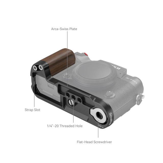 SmallRig Wooden L-Shape Grip für FUJIFILM X-T50 (Schwarz) 4784 wurde entwickelt, um den Griff der Kamera zu verbessern. Der L-förmige Griff wird mit einer 1/4"-20 Schraube an der Unterseite der Kamera befestigt, und die eingebauten Silikonpolster verhindern Kratzer. Der Handgriff besteht aus natürlichem Massivholz, das sich elegant und natürlich anfühlt, und ist ergonomisch gestaltet, um das Griffgefühl zu verbessern. Die eingebaute Arca-Swiss-Schnellwechselplatte ermöglicht eine einfache und schnelle Montage und Demontage des Arca-Stativs. Vier 1/4"-20-Gewindebohrungen an der Unterseite zur Befestigung von Manfrotto-Platten und Stativen. Riemenschlitz für Handgelenkriemen (ID: 3848). Der eingebaute Flachschlüssel an der Unterseite erleichtert die Montage und Demontage von Zubehör. Der Griff wird mit einer exklusiven Blitzschuhabdeckung geliefert, auf der als Hommage an FUJIFILM die Schallwelle "FUJIFILM" und das Gründungsjahr aufgedruckt sind. Außerdem verfügt er über einen Auslöser, der einen weichen und bequemen Griff gewährleistet.