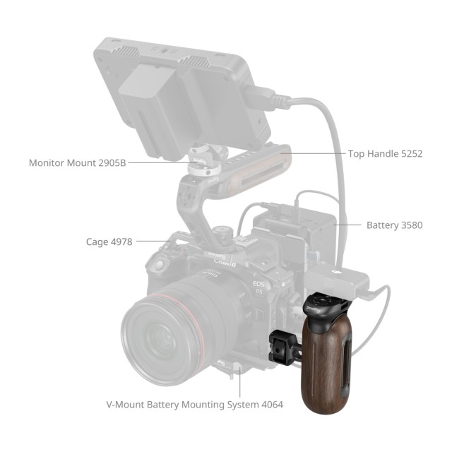 Der seitliche Griff verfügt über eine Kaltlichthalterung an der Oberseite für Mikrofone oder Scheinwerfer und eine 1/4"-20 Aufnahmebohrung für diverses Zubehör, wie z. B. magische Arme und Monitorhalterungen (ID 4886). Außerdem bietet er eine vertikale Verstellung von 29 mm für eine optimal ausbalancierte Steuerung.