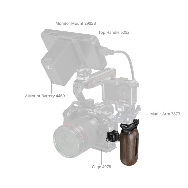 Der SmallRig Holzseitengriff mit NATO-Klemme 5239 wurde für das bequeme Schießen aus der Hand entwickelt. Er lässt sich mit der NATO-Klemme leicht an Käfigen mit NATO-Schiene befestigen und wird mit einem Inbusschlüssel sicher festgezogen.